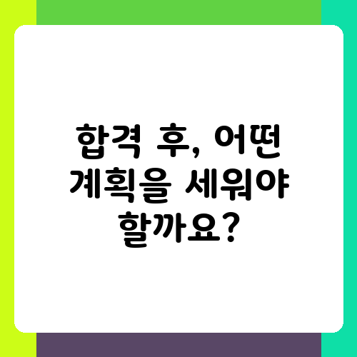 검정고시에 합격했다면, 축하드립니다! 이제 앞으로의 계획을 세우는 것이 중요해요. 대학교 진학을 목표로 한다면, 원하는 대학교와 학과를 정하고 입시 준비를 시작해야 합니다. 취업을 목표로 한다면, 자신의 강점과 약점을 파악하고 취업 준비를 시작해야 하고요. 무엇보다도 자신의 목표를 명확히 하고, 그 목표를 달성하기 위해 꾸준히 노력하는 것이 중요합니다. 합격 후에도 꾸준히 노력하는 자세를 잃지 않고, 자신의 꿈을 향해 나아간다면 분명 성공적인 미래를 만들 수 있을 거예요. 검정고시 합격을 통해 얻은 자신감을 바탕으로 새로운 도전을 두려워하지 말고, 끊임없이 배우고 성장하는 삶을 살아가세요.