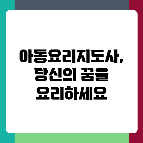 지금까지 아동요리지도사가 되기 위한 과정과 필요한 자질, 그리고 미래 전망에 대해 알아보았습니다. 아동요리지도사는 단순한 직업이 아니라, 아이들의 건강한 성장에 기여하는 보람 있는 직업이라고 생각합니다. 아이들의 꿈을 키우고, 건강한 미래를 만드는 데 함께하고 싶으시다면, 아동요리지도사의 길에 도전해 보세요! 자신의 열정과 노력을 담아 아이들에게 즐거움과 행복을 선사하는 아동요리지도사가 되길 응원합니다. 궁금한 점이나 더 자세한 정보가 필요하다면 언제든지 질문해주세요!